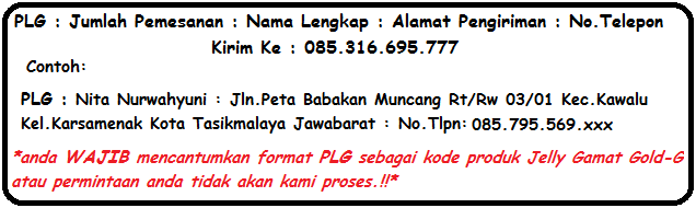 Suatu trobosan terbaru dalam mengobati nyeri dan pegal diseluruh badan dengan pengobatan yang sangat cepat dan memang sudah terbukti efektif, ampuh dan tentunya juga sangat aman tanpa menimbulkan efek samping apapun dan juga bisa dikonumsi oleh semua kalangan usia dari mulai bayi, balita, anak-anak, dewasa, ibu hamil, ibu menyusui, dan juga lansia hanya dengan mengkonsumsi obat nyeri di seluruh badan dari jelly gamat gold-g sea cucumber yang tidak perlu diragukan lagi dalam keasliannya karena memang sudah terdaftar di BPOM RI TI 114645721. Untuk mengobati nyeri dan menghilangkan pegal pegal di badan disini kami merekomendasikan Obat Nyeri Di Seluruh Badan dari Jelly Gamat Gold-G , untuk alasan mengapa gold g bagus untuk penyembuhan nyeri dan pegal di seluruh badan ? simak saja dibawah ini. Jelly Gamat Gold-G merupakan sebuah minuman kesehatan yang di produksi oleh PT GIT ( GNE Internet Trading ) dan terbuat dari 100% bahan alami yang hidup didasar laut yaitu Teripang tapi yang dipakai dalam pembuatan Gold-G bukanlah teripang sembarangan melainkan Teripang Emas atau "Golden Stichopus Variegatus" dimana teripang jenis ini merupkan satu-satunya jenis teripang yang ada didunia dan mempunyai hasiat yang luar biasa dalam mengobati berbagai penyakit. Alasan mengapa Jelly Gamat Gold-G direkomendasikan sebagai obat nyeri dan pegal diseluruh badan ialah : Berikut alasannya : Seperti hasil riset oleh Dr. Mitchell Kurk dari Pusat Revitalisasi Biomedis, Newyork, Amerika. menunjukkan hewan gamat berkhasiat untuk meningkatkan kesehatan fisik bagi 70% penderita radang sendi yang diakibatkan pegal linu. ini karena glukosamin yang terkandung dalam tubuh gamat dapat merangsang tubuh untuk mensekresikan cairan sinovial untuk lubrikasi persendian. Menurut Walter Kee Mun Yee, alumnus Wisconsin University di pulau langkawi, Malaysia : ekstrak teripang obat pegal linu di kaki atau gamat tersohor sebagai obat tradisional nyeri sendi akibat rematik / asam urat. ahli nutrisi tersebut mengatakan gold-g berbahan dasar teripang emas mengandung kondroitin dan glukosamin. Kondroitin dan Glukosamin sulfat berperan memulihkan penyakit sendi, sedangkan glukosaminoglikan merupakan zat antithrombogenik yang melancarkan peredaran darah yang menggumpal. pada penderita asam urat, jumlah glukosamin dan kondroitin sedikit, dengan pengkonsumsian teripang ini, dapat menstabilkan jumlah glukosamin tersebut sehingga dapat mengatasi asam urat berlebih. Itulah penjelasan mengenai khasiat dari Gold-G dalam mengobati nyeri dan pegal pegal di badan untuk itu tunggu apalagi pesan Gold-G sekarang juga dan rasakah khasiatnya oleh anda sendiri. BARANG SAMPAI BARU BAYAR (Untuk Pemesanan 1-2 Botol) Untuk pemesanan silahkan anda Kirim Via Pesan Singkat ke : 085.316.695.777 dengan Format seperti dibawah ini : Daftar Harga Jelly Gamat Gold-G : ![]() Untuk pembayaran bisa melalui salah satu bank dibawah ini : Bank BCA KCU Tasikmalaya No. Rekening : 054-0606-196 Atas Nama : Aryanto Bank BRI Cab. Tasikmalaya No. Rekening : 0100-01-054862-50-5 Atas Nama : Aryanto Bank BNI KC Tasikmalaya No.Rekening : 0226098704 Atas Nama : Aryanto Bank Mandiri KCP Tasikmalaya No. Rekening : 131-00-0994255-0 Atas Nama : Aryanto Bank CIMB Niaga Cab. Tasikmalaya No. Rekening : 439-01-01029-11-8 Atas Nama : Aryanto TOLONG SEGERA TRANSFER PEMBAYARAN SETELAH BARANG DI TERIMA
